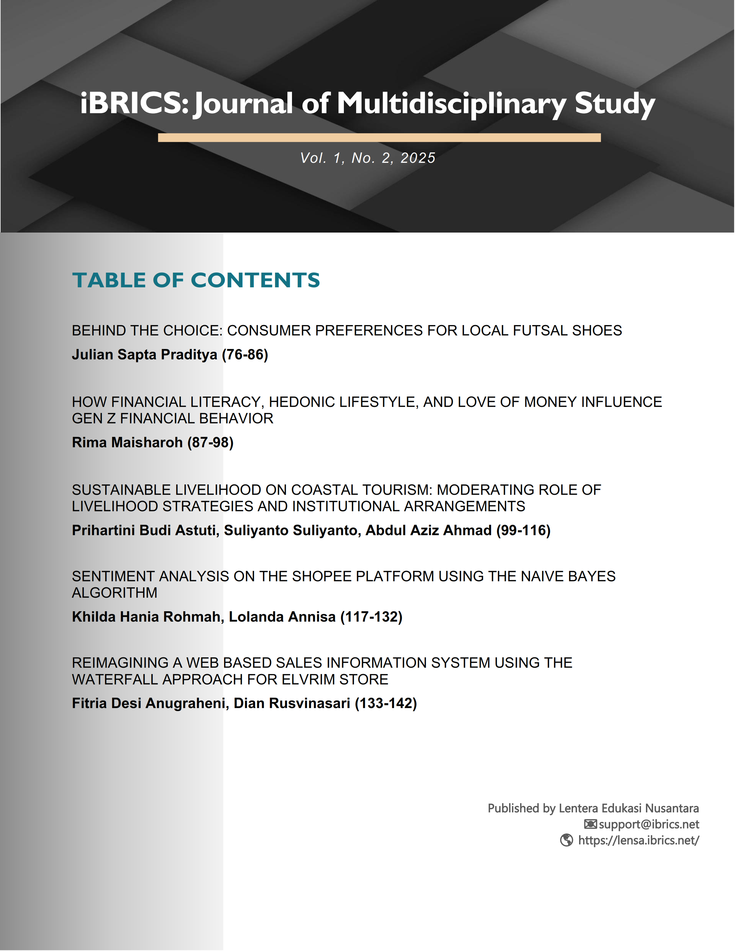 This inaugural issue of iBRICS: Journal of Multidisciplinary Study presents five articles that reflect the journal’s commitment to interdisciplinary scholarship. The collection brings together studies from business, finance, tourism, digital analytics, and information systems, highlighting current academic conversations across multiple fields. The issue showcases how diverse research perspectives contribute to a broader understanding of emerging challenges within contemporary economic and technological contexts.